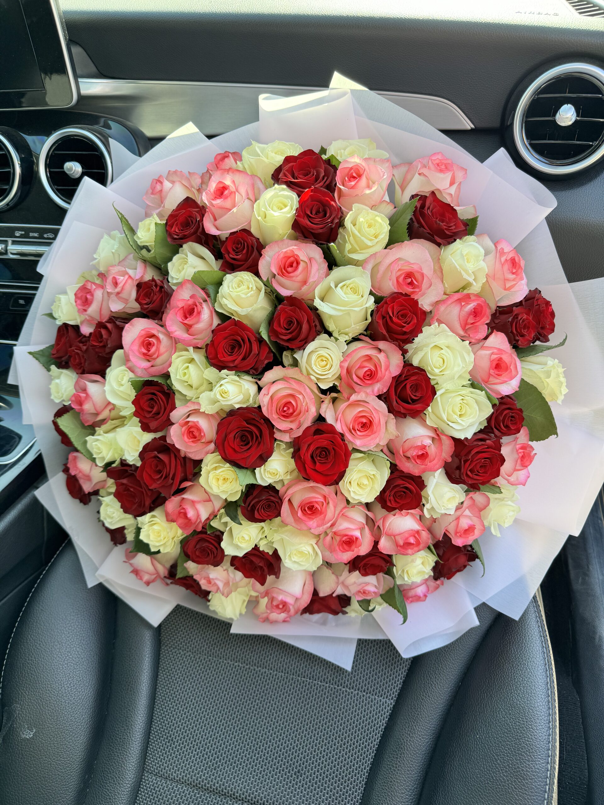 Склад : 101 троянда червона , рожева , біла , пакування.
