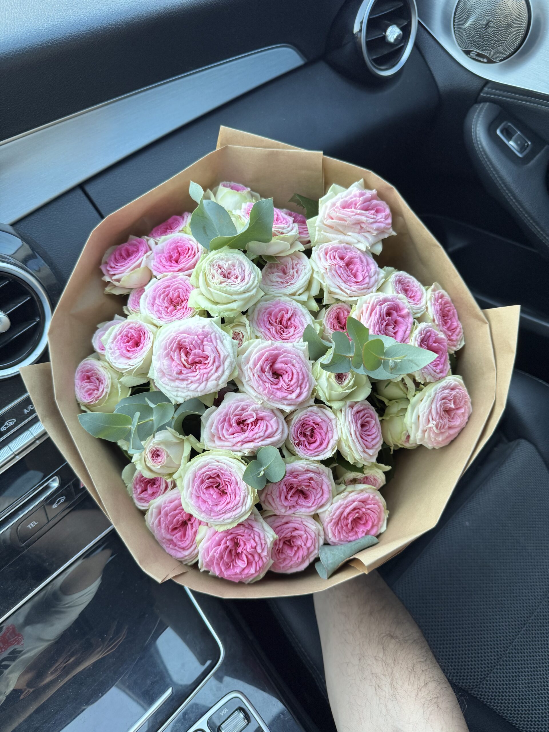 Склад : 11 кущових піоноподібних троянда, 4 гілочки евкаліпту , пакування.