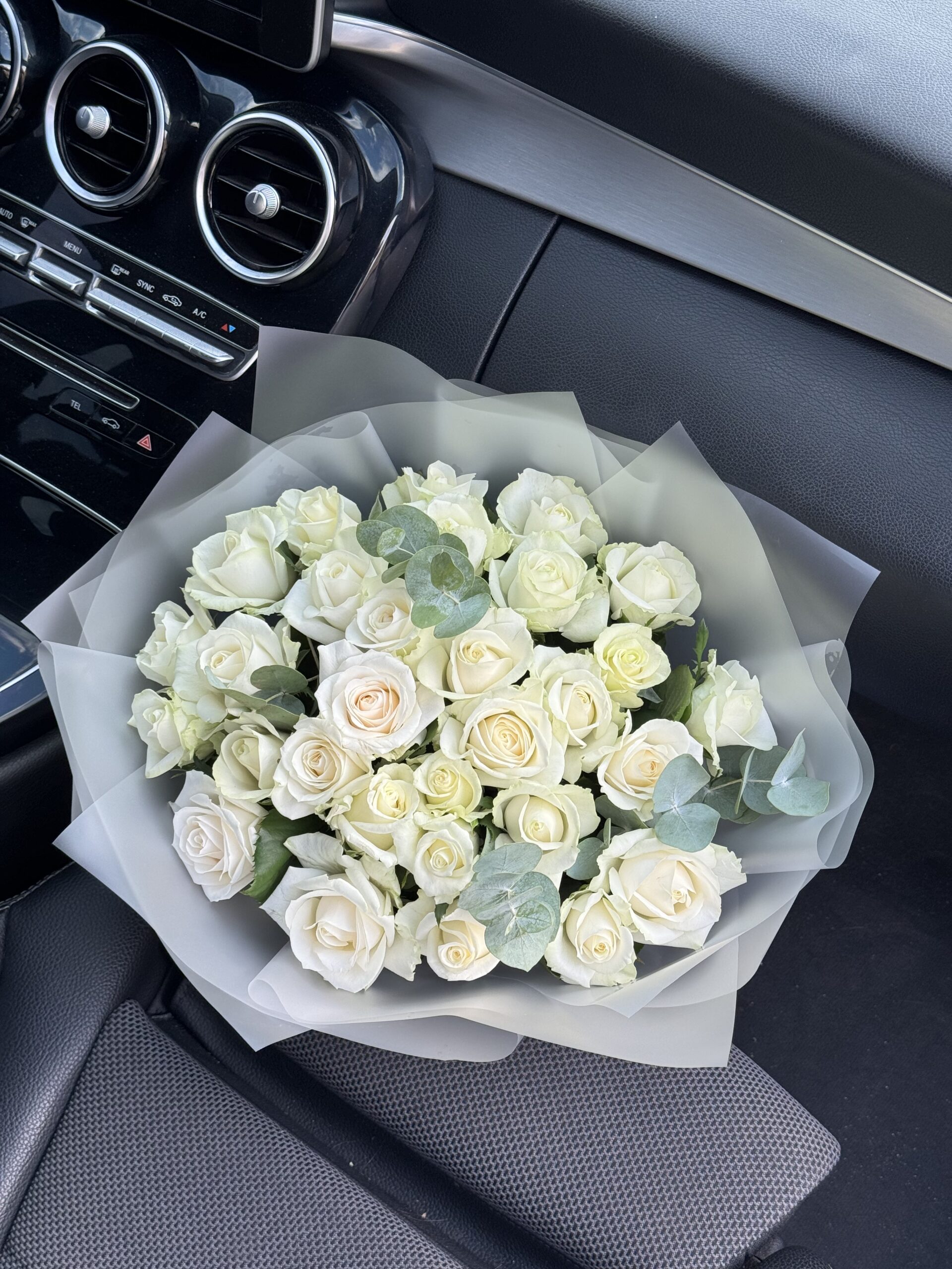 Склад : 31 біла троянда , евкаліпт , пакування.
