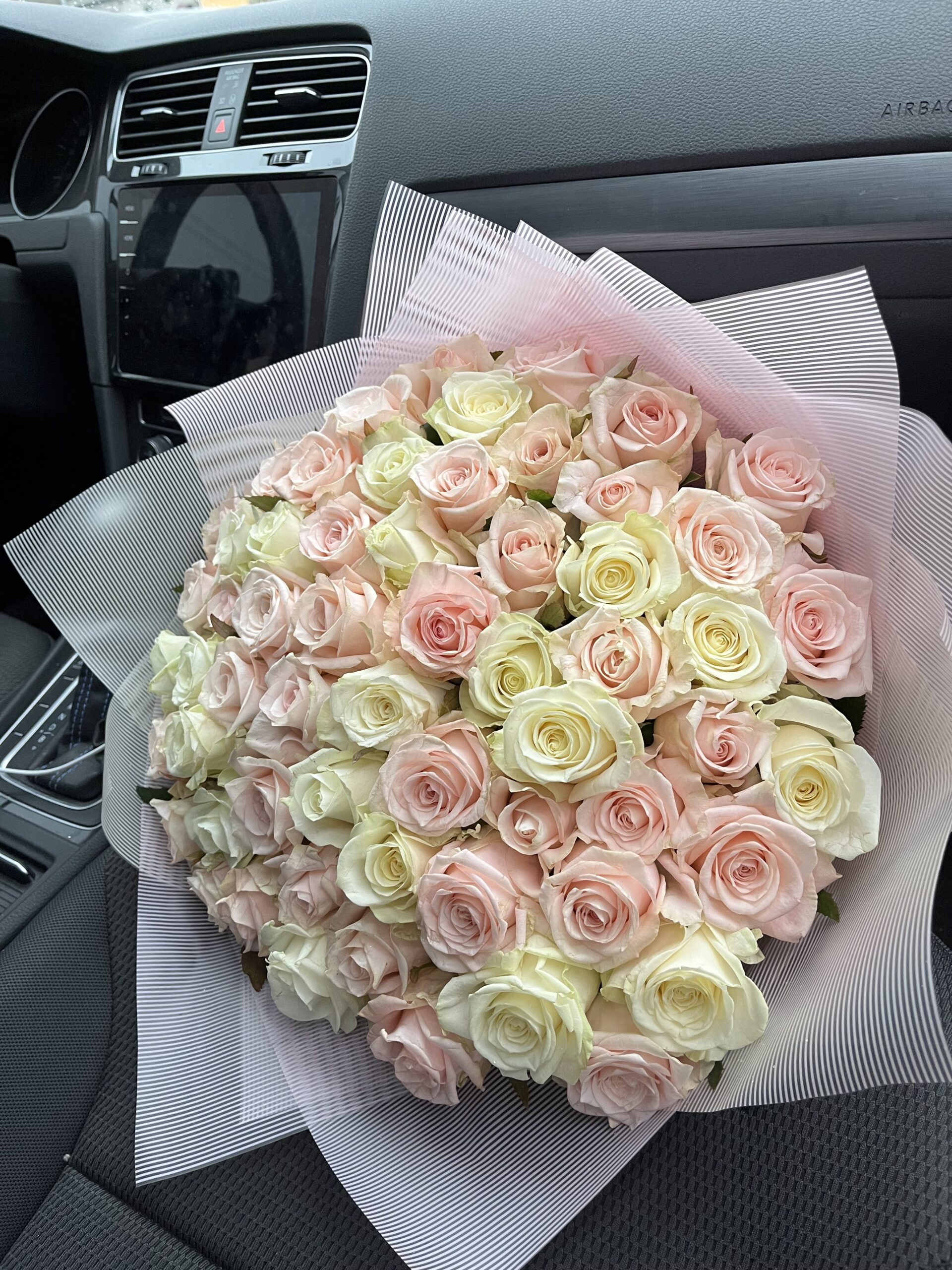 Склад: 30 білих троянд , 29 рожевих троянд , пакування.