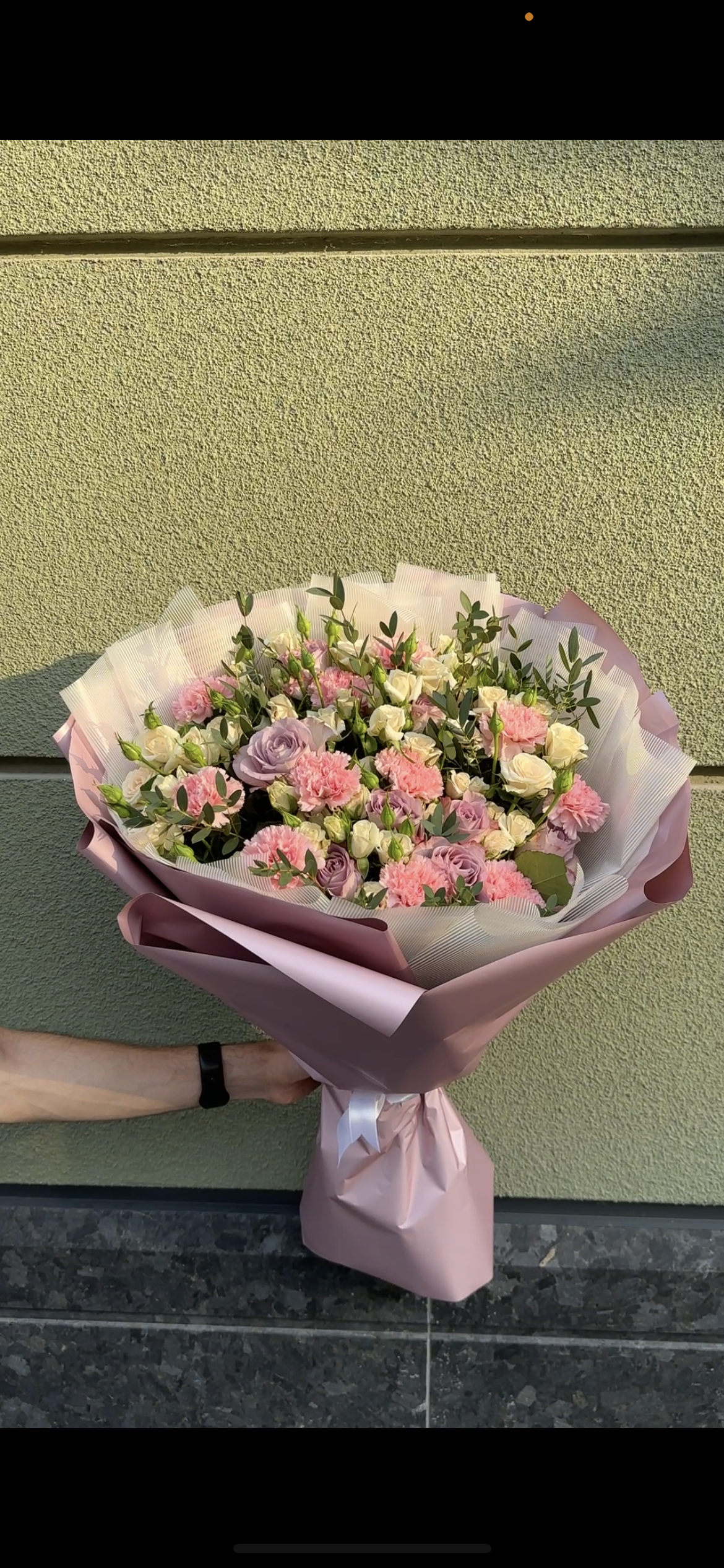 Склад : 9 троянд, 10 кущових троянд , 13 гвоздик ,11 гілочок евкаліпту , пакування.