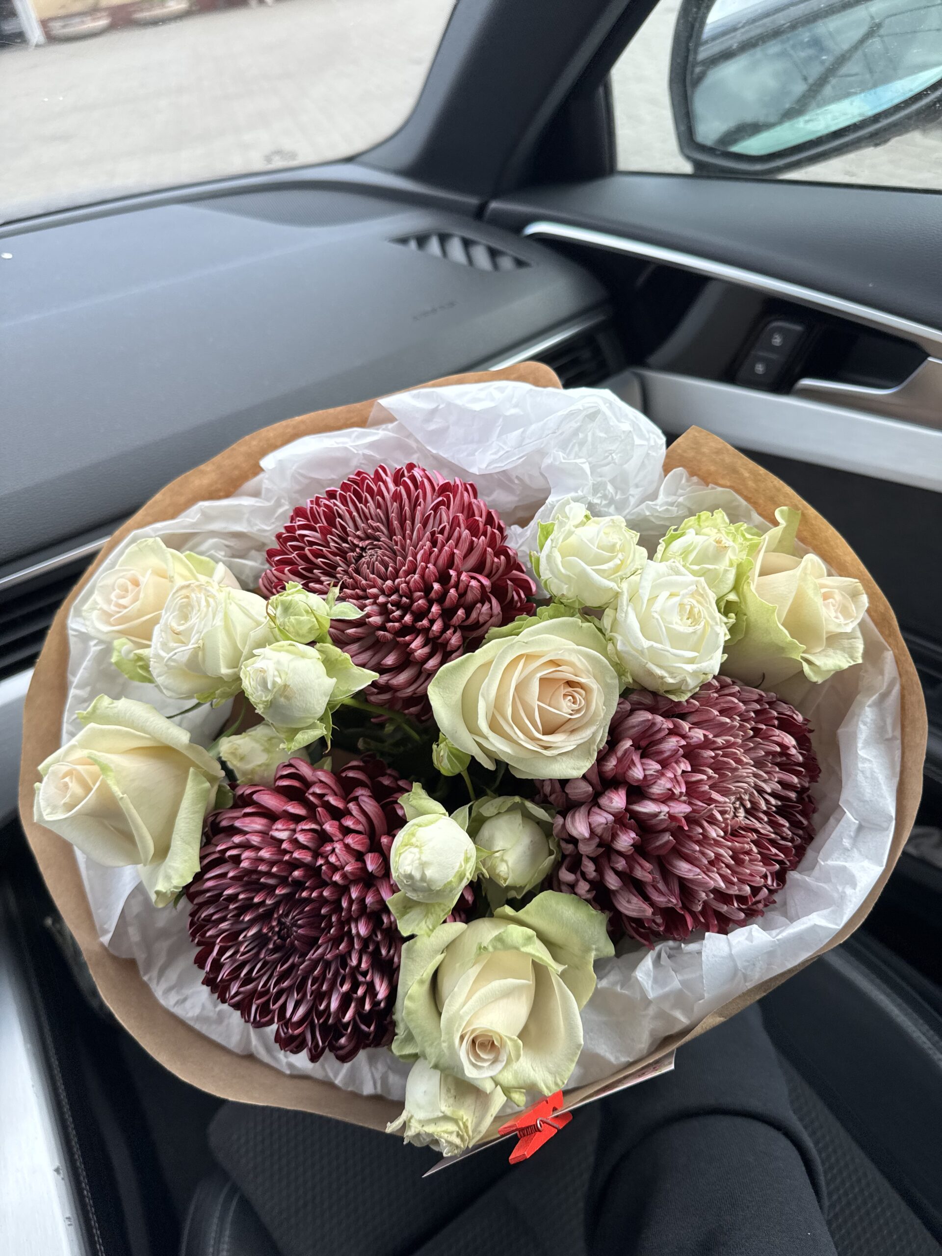 Склад : 5троянд , 3 хризантеми , 3 кущові піоноподібні троянди , евкаліпт , еко пакування.