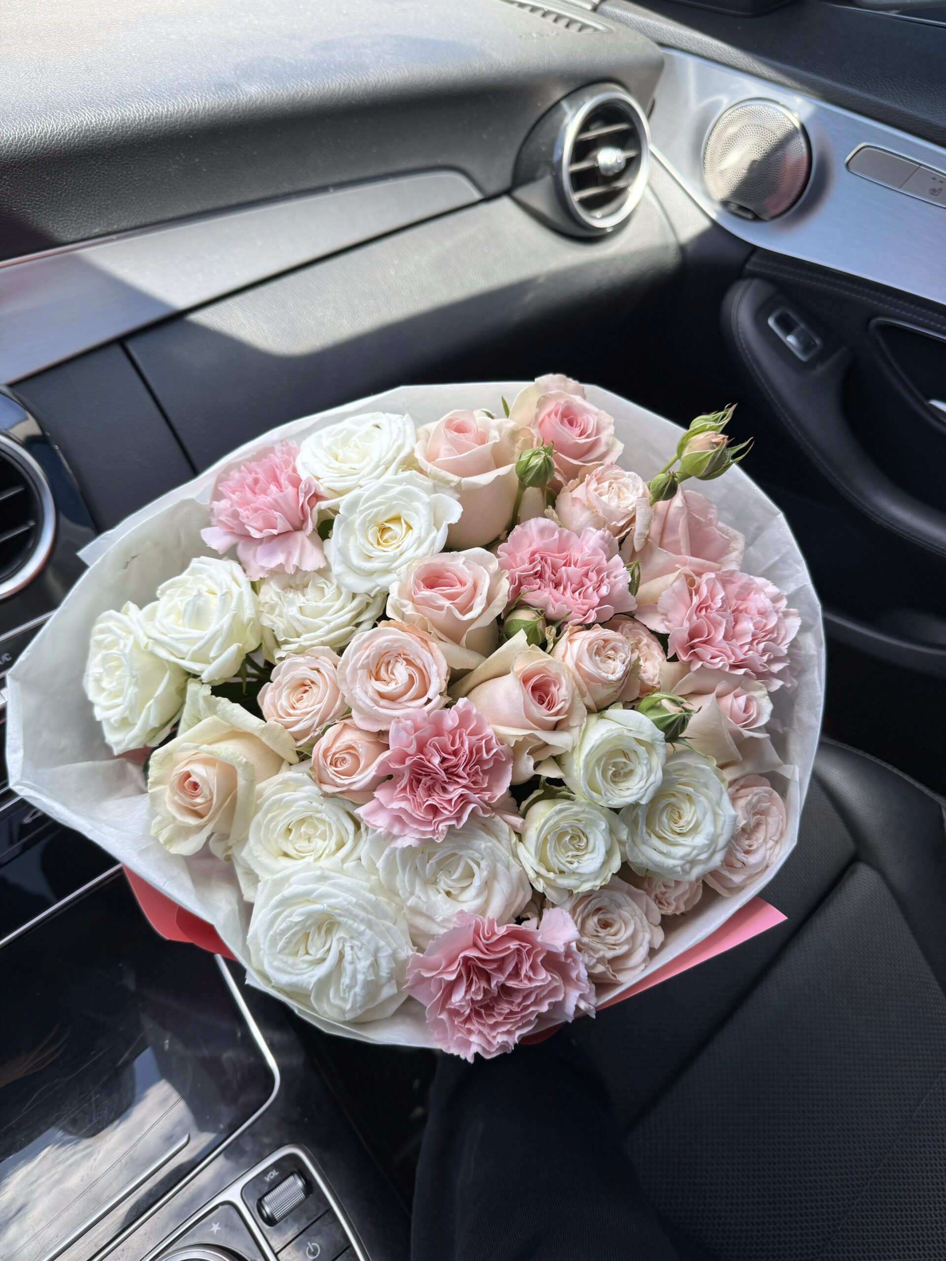 Склад : 3 рожевих кущових троянди , 4 білих кущових троянди , 5 гвоздик , 5 троянд , фірмове пакування.