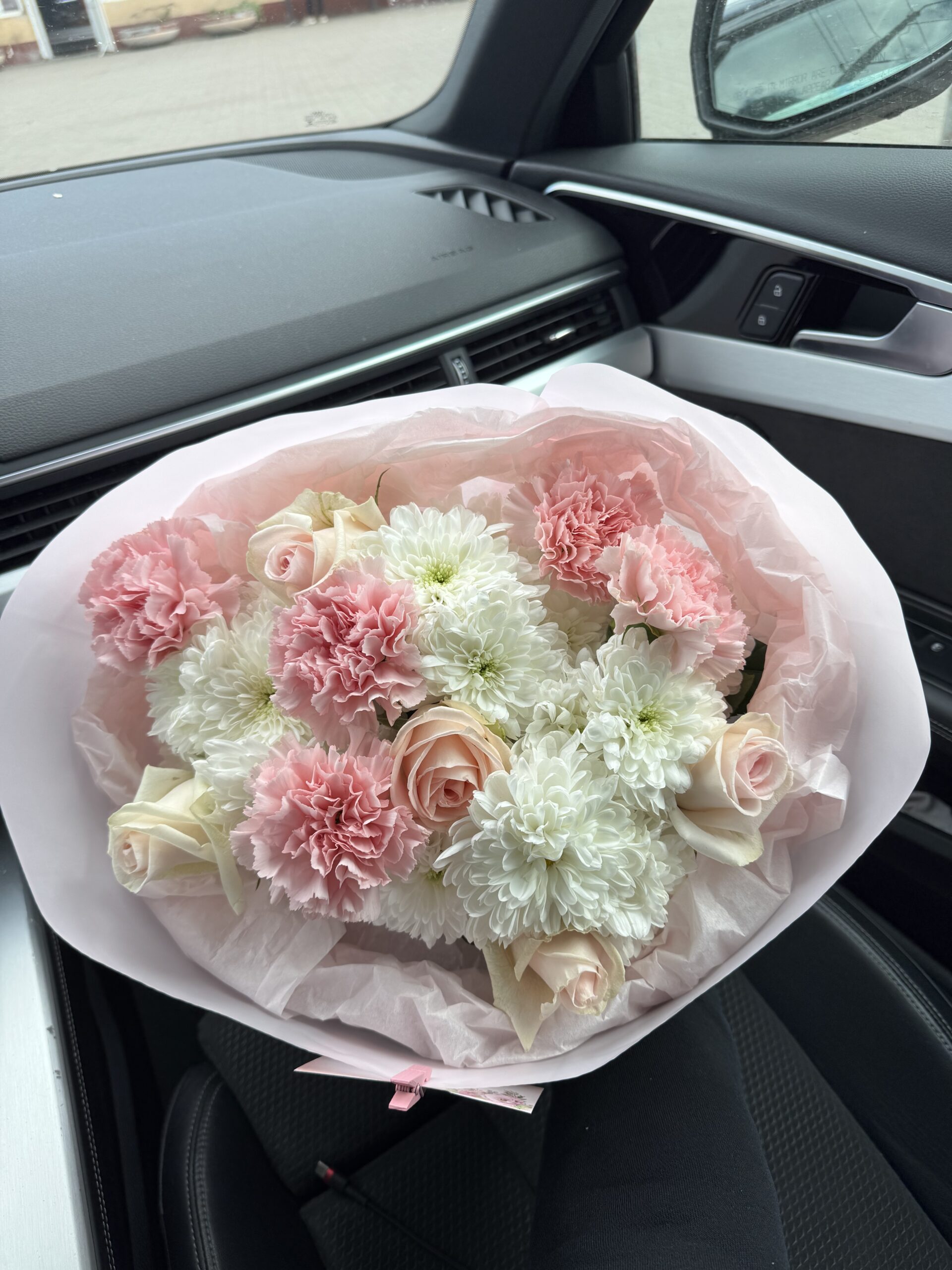 Склад : 5 троянд , 3 хризантеми , 5 гвоздик , пакування.
