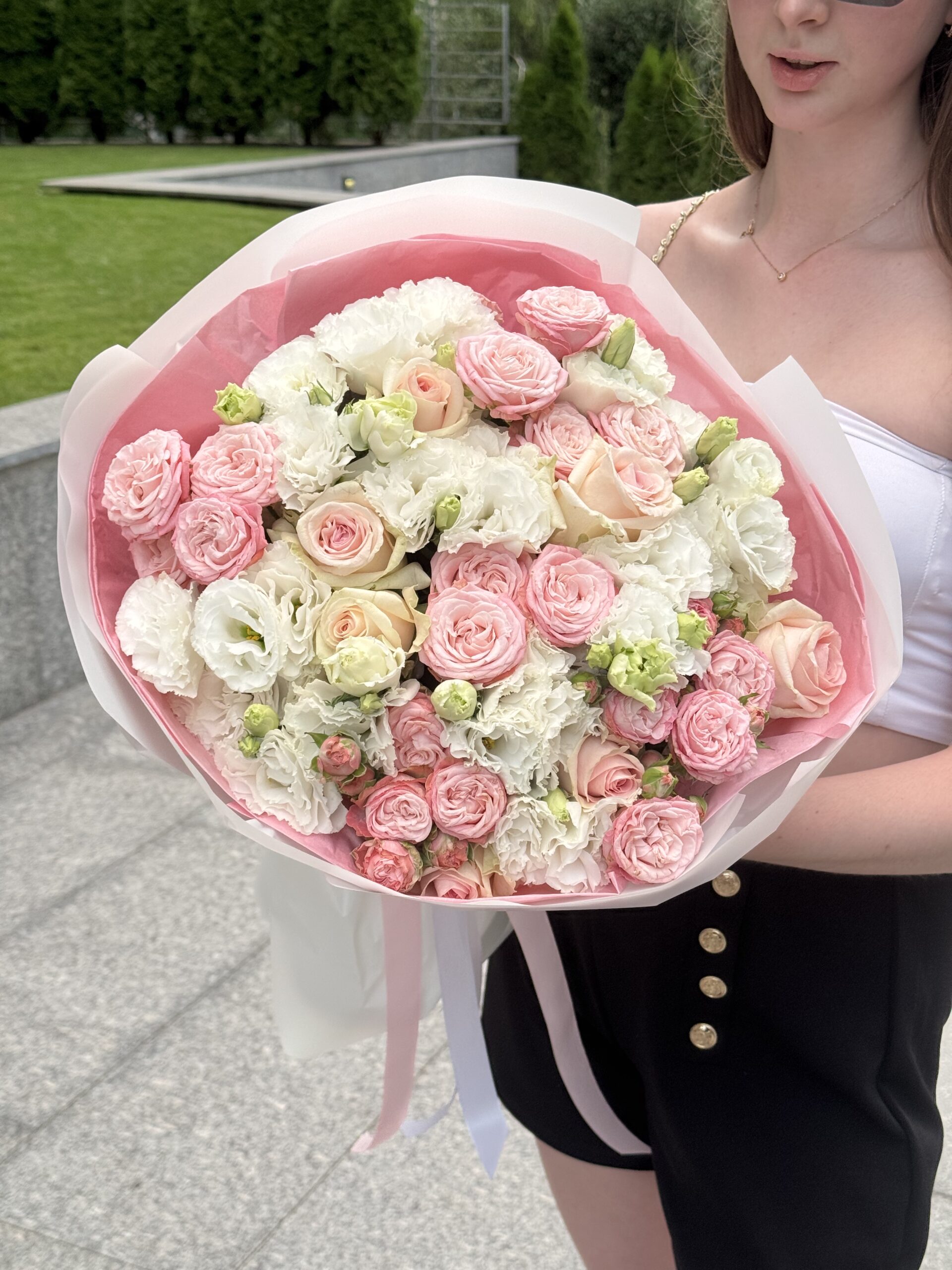 Склад : 5 рожевих кущових троянд , 10 еустом , 7 троянд , пакування .