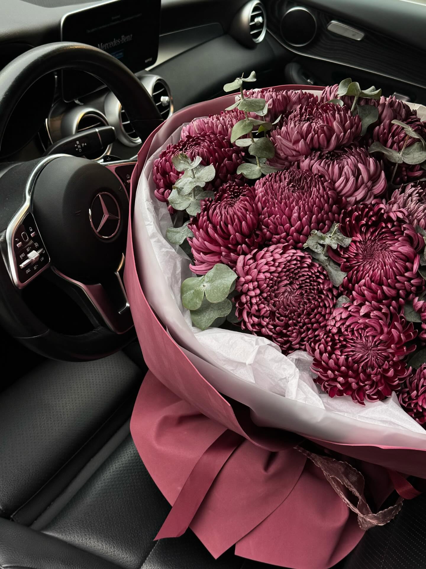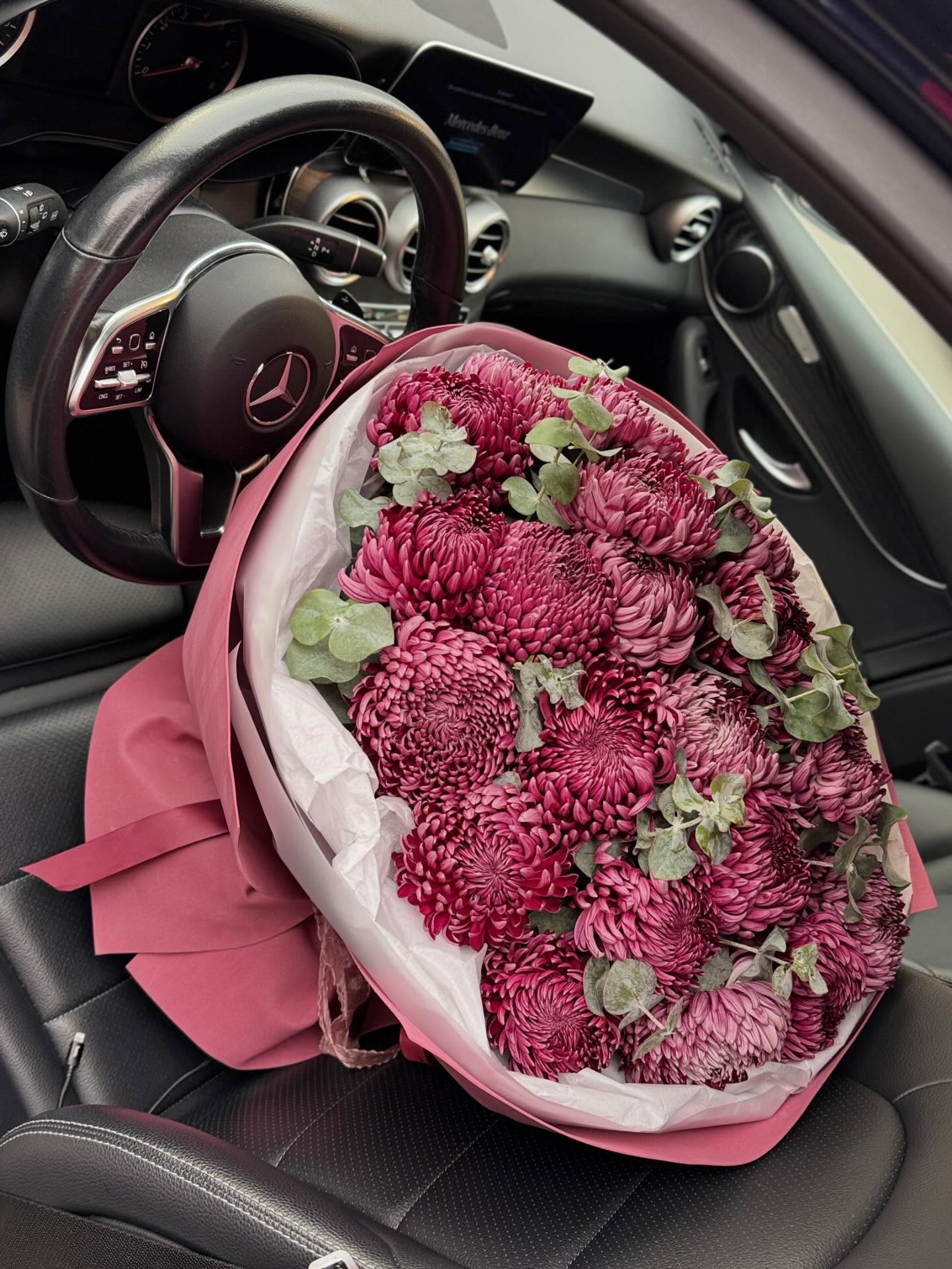 29 хризантем, 10 гілок евкаліпту, преміум пакування.