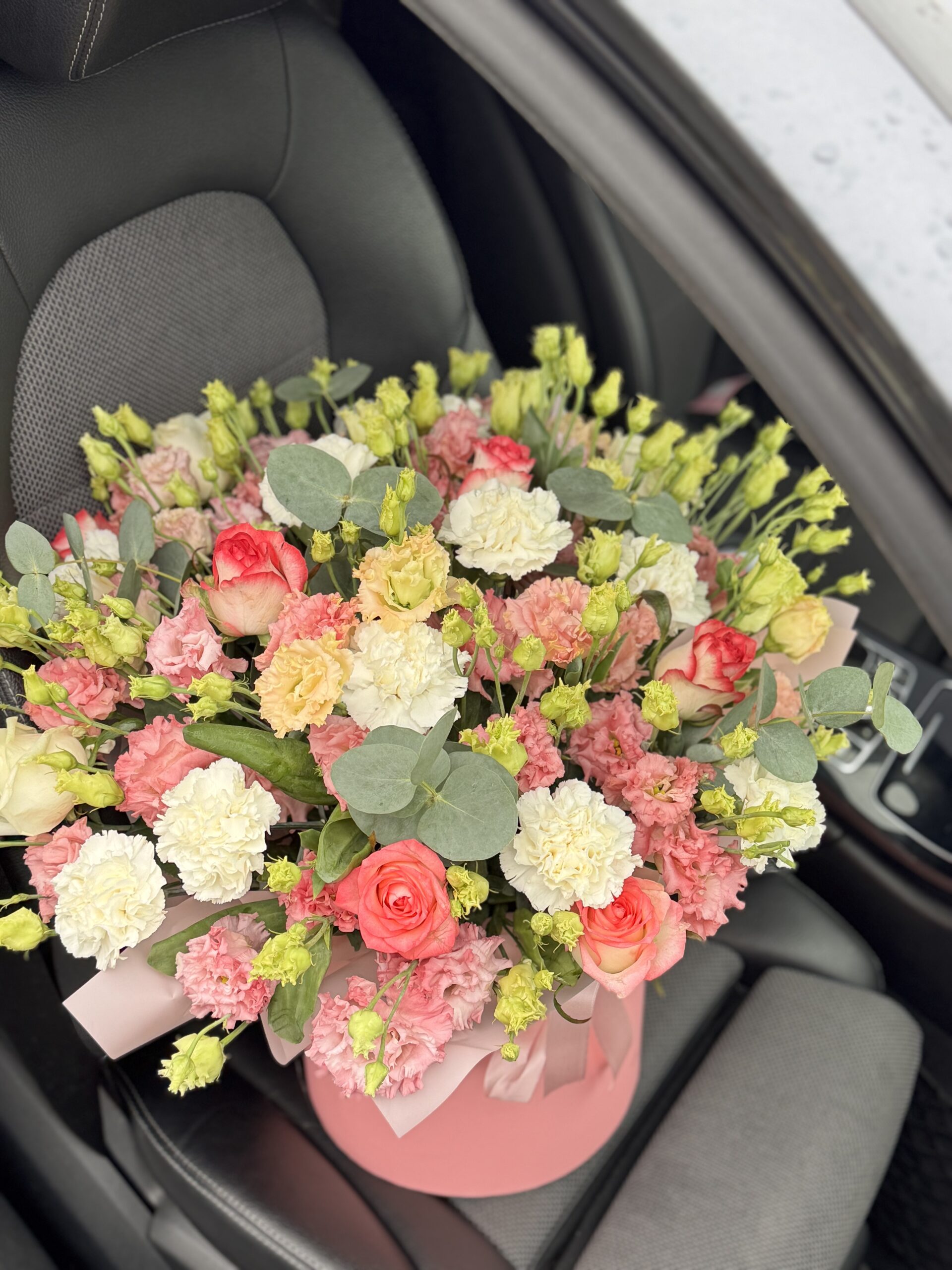 Склад : 9 еустом , 7 гілочок евкаліпту , 10 гвоздик , 9 троянд ,
