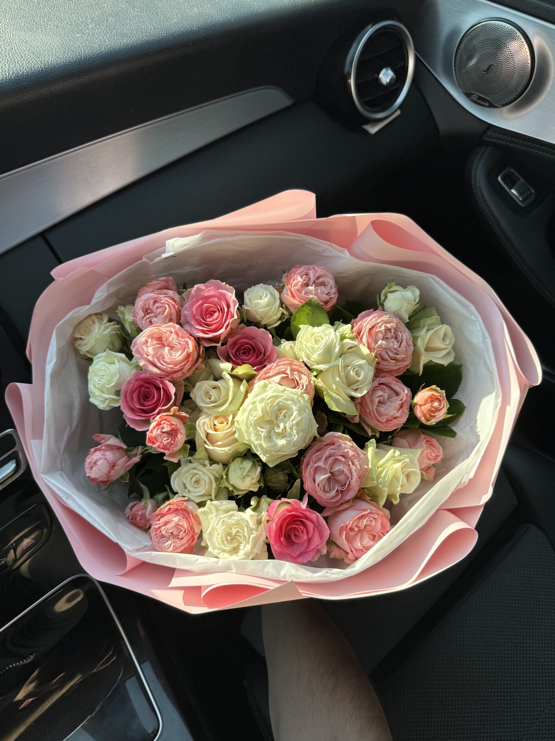Склад : 4 рожева троянди , 5 кремових троянд , 3 рожеві кущові троянди , 3 білі кущові троянди , пакування.