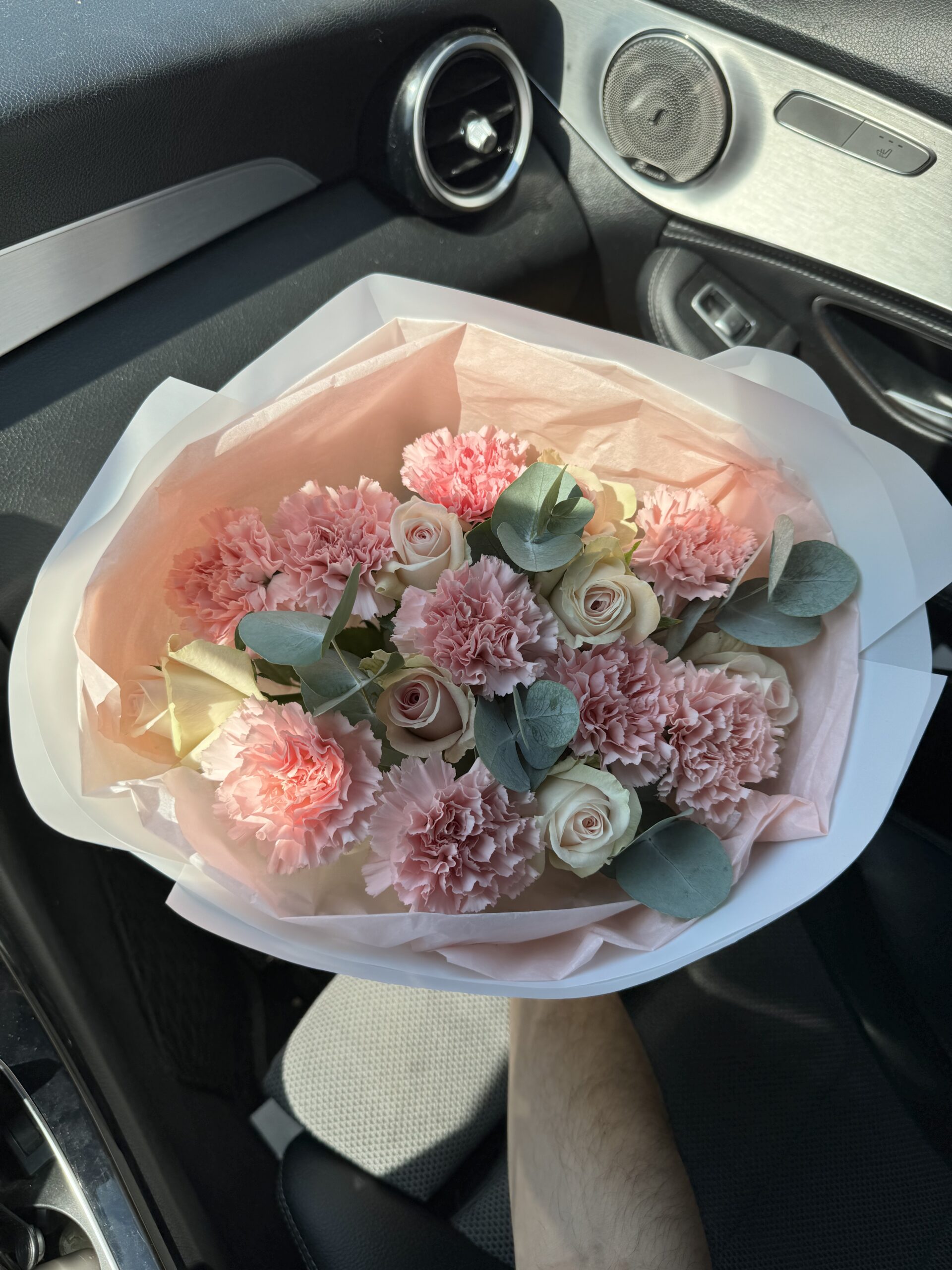 Склад : 7 троянд , 8 гвоздик , 4 гілочки евкаліпту , пакування.