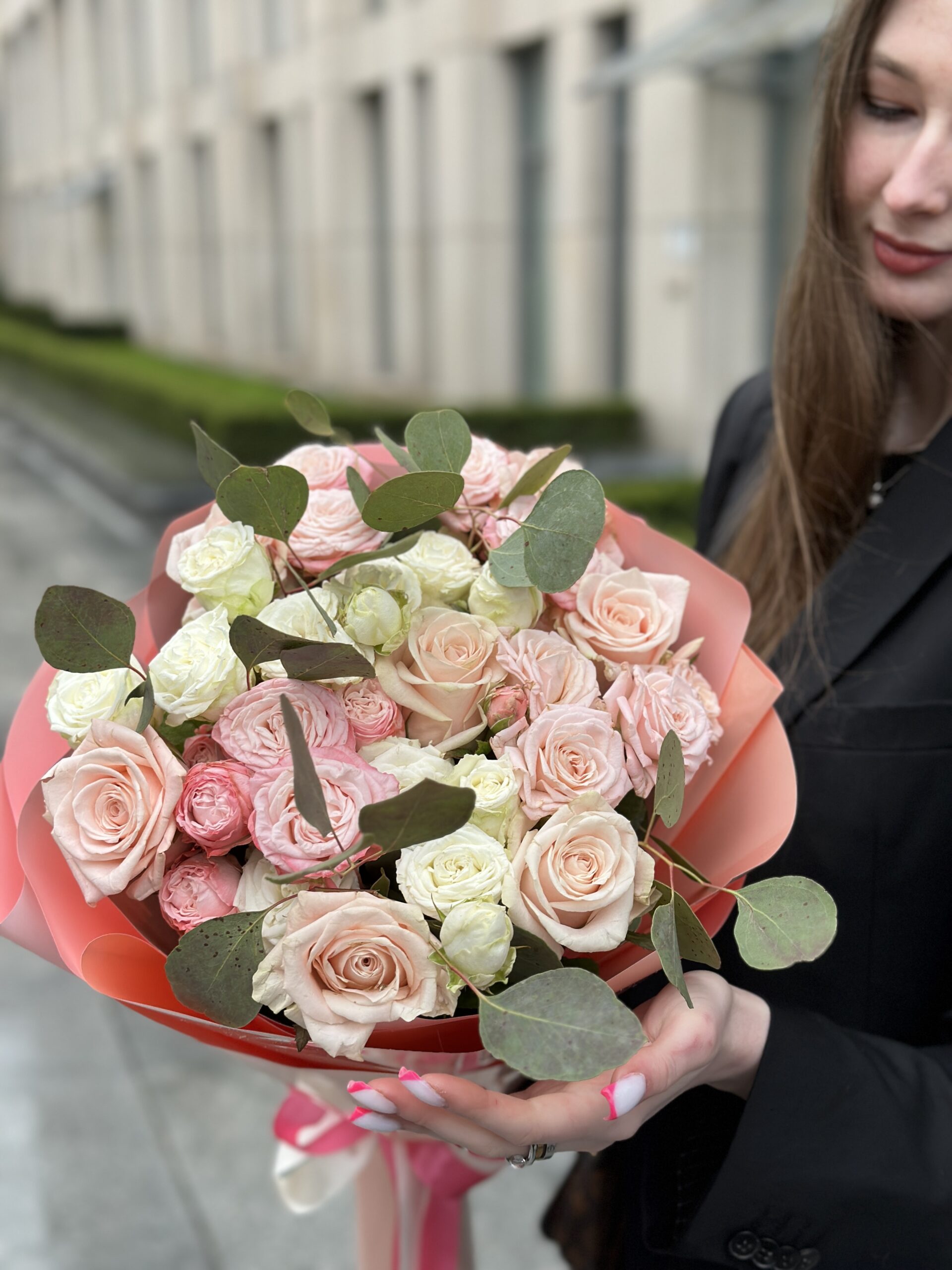 Склад : 5 троянд , 6 кущових піоноподібних троянд , 6 гілочок евкаліпту , пакування.