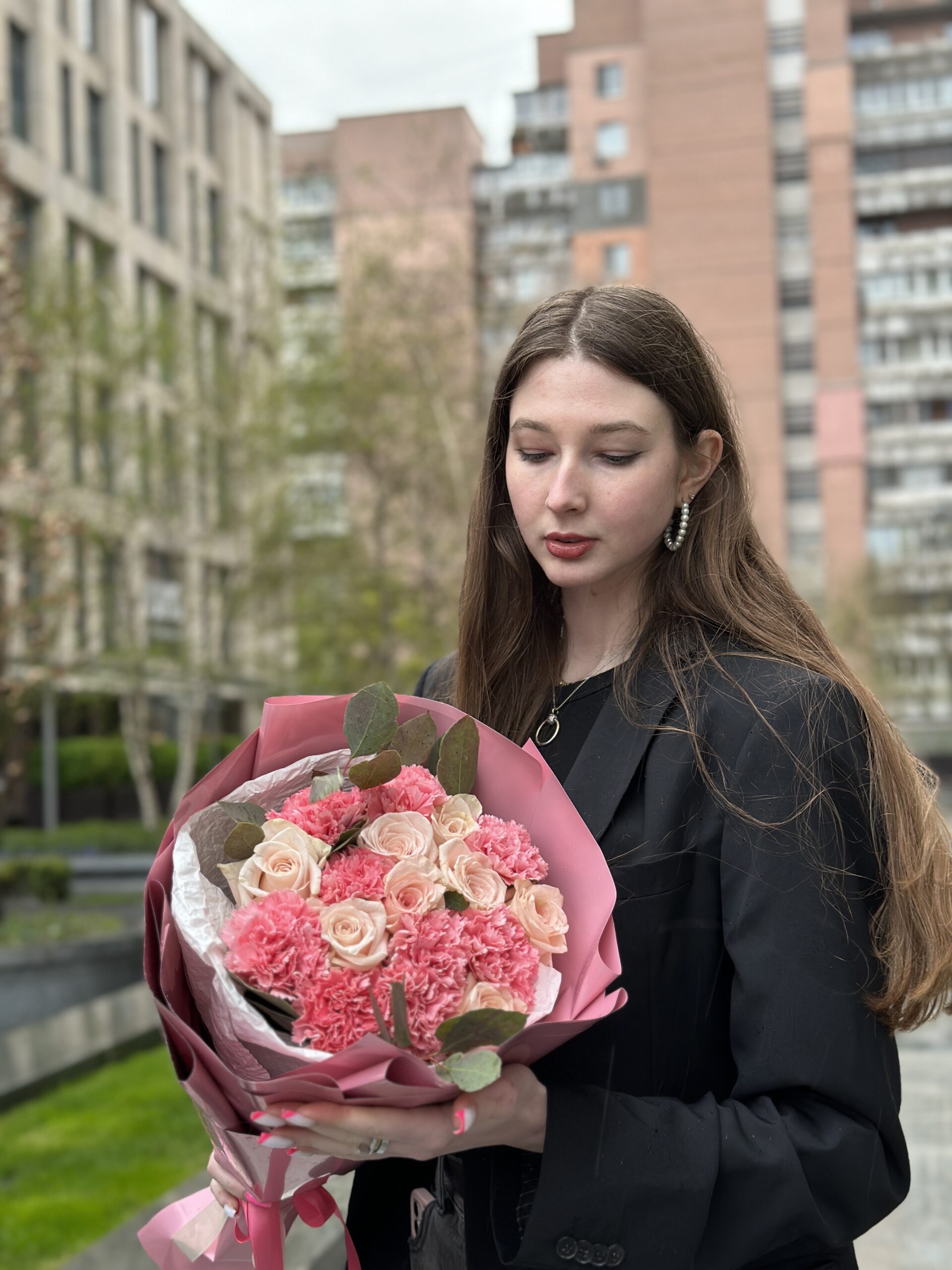 Склад : 7 троянд , 10 гвоздик , 4 гілочки евкаліпту , пакування.