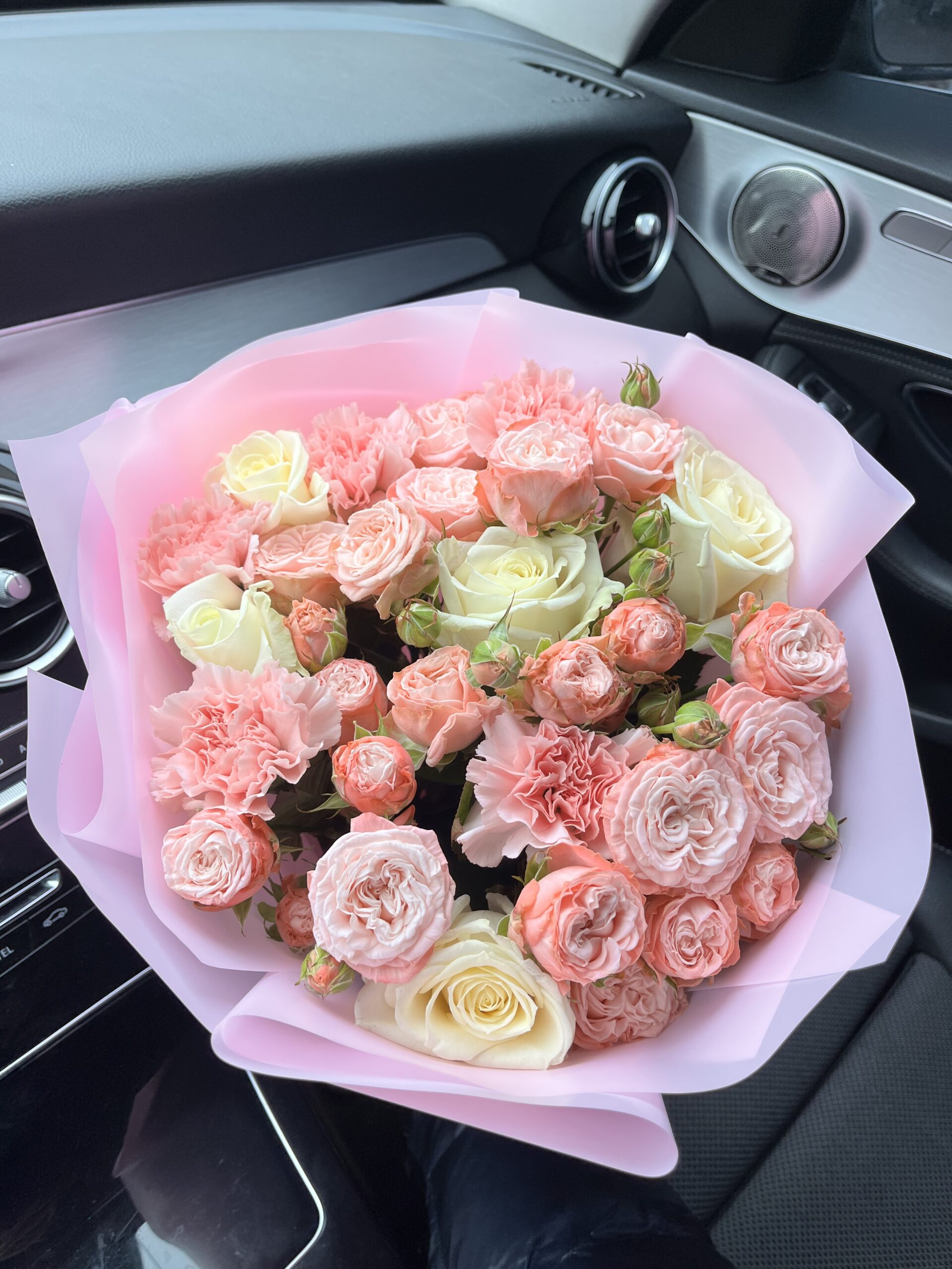 Склад : 5 троянд , 5 гвоздик ,7 кущових піоноподібних троянд , пакування.