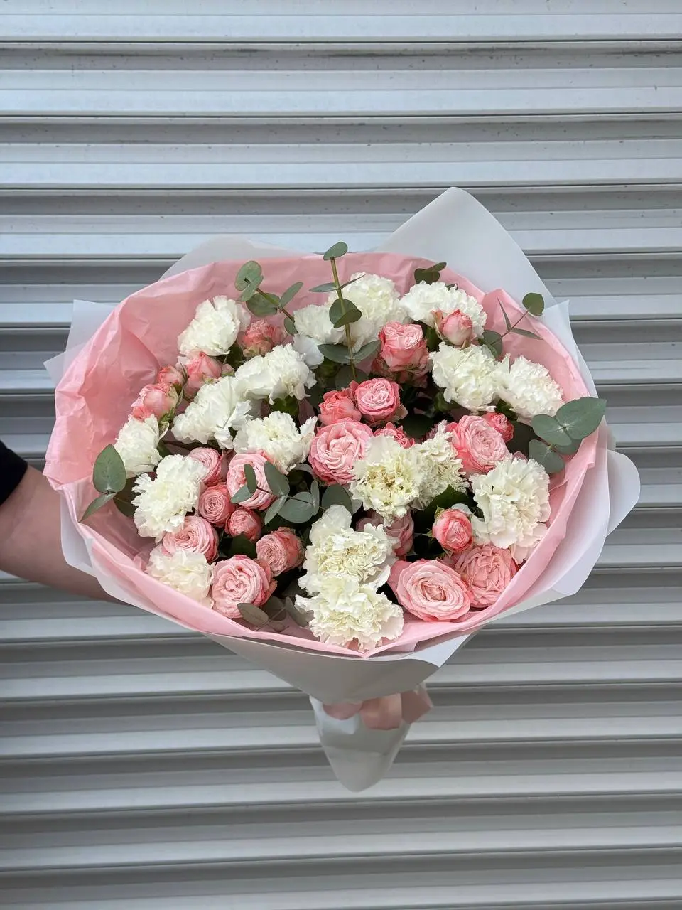 Склад : 9 рожевих кущових троянд , 15 гвоздик , 5 гілочкок евкаліпту , фірмове пакування.
