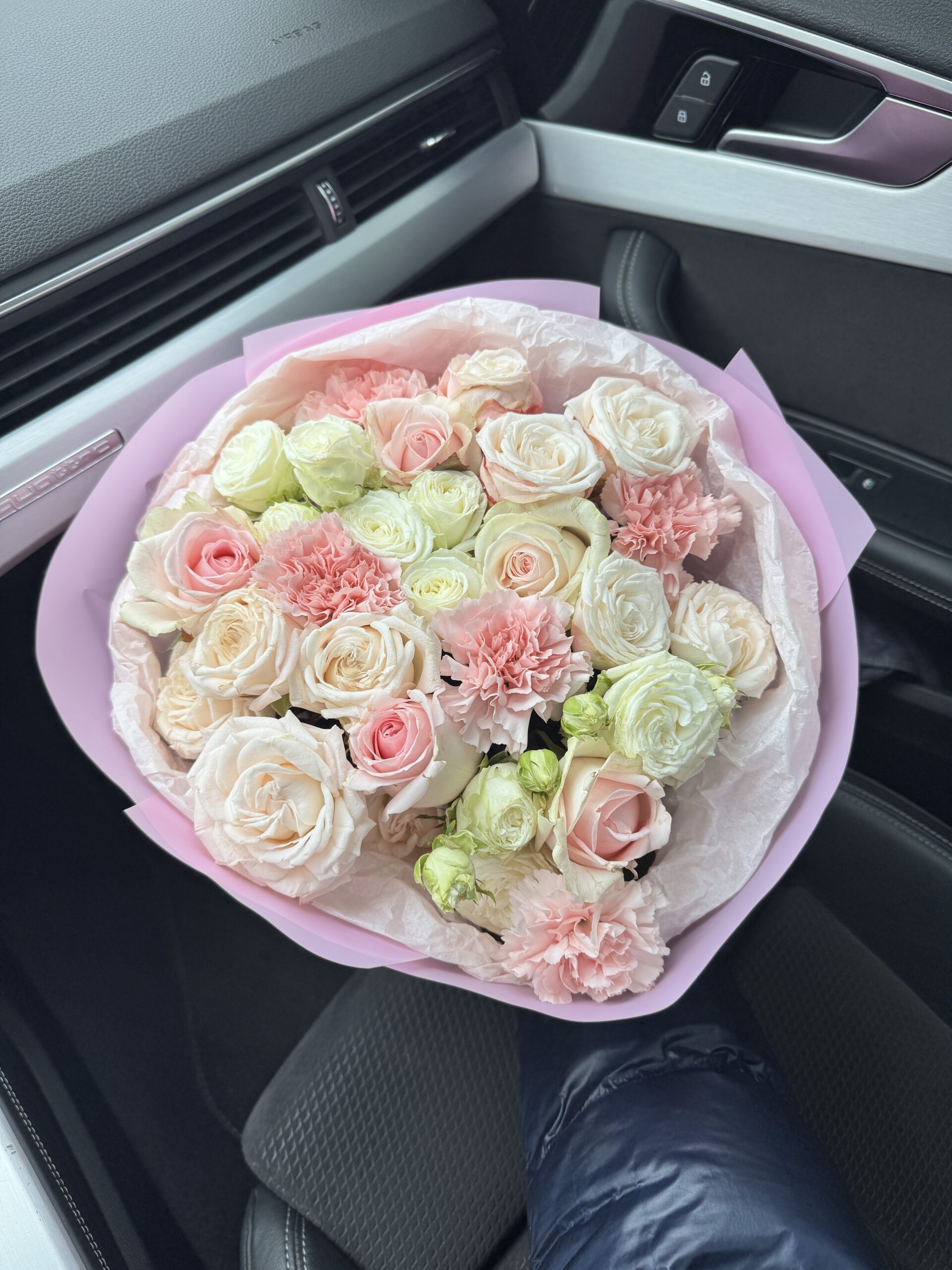 Склад : 4 рожеві кущових троянди , 3 білі кущові троянди , 5 гвоздик , 5 троянд , фірмове пакування.