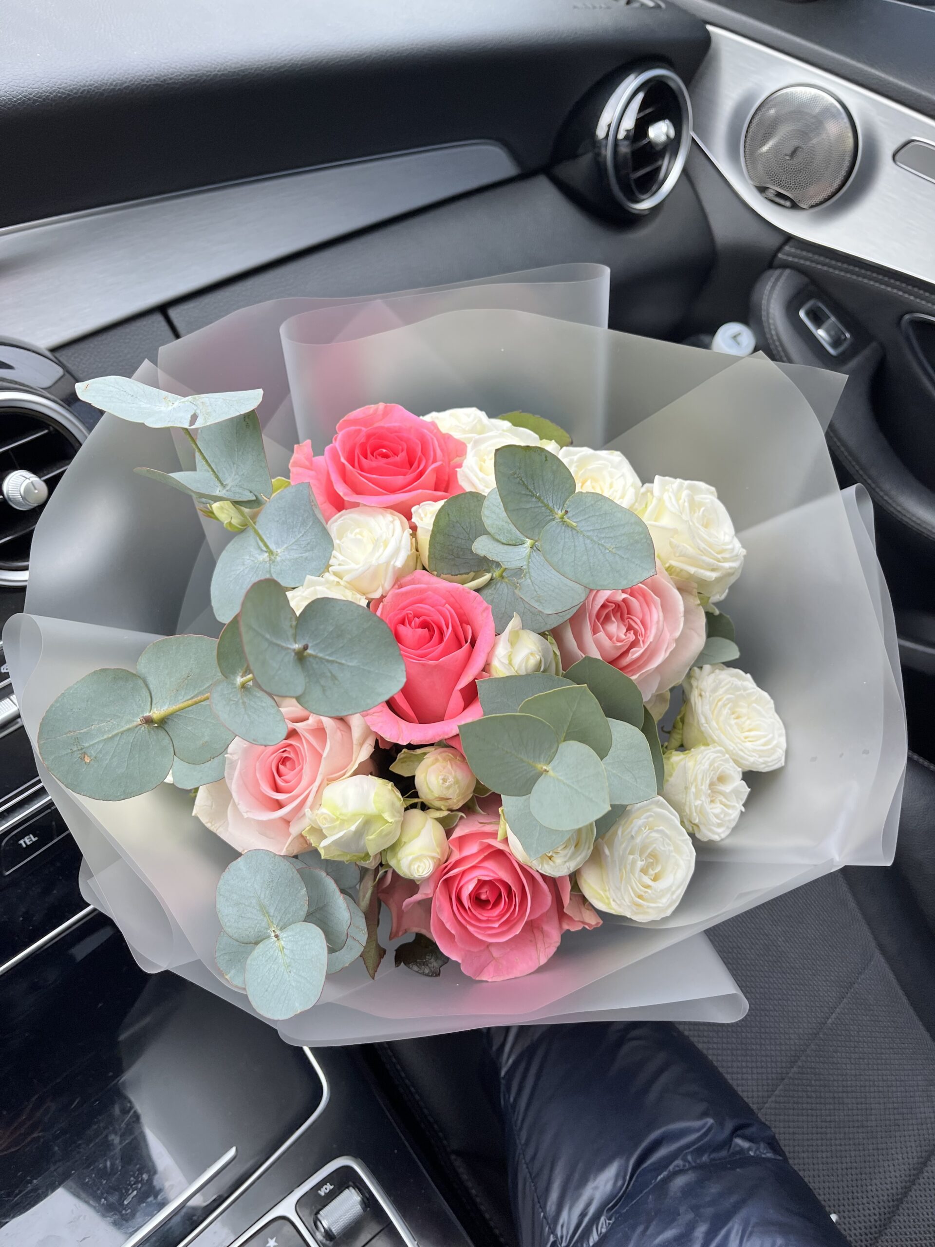 Склад : 4 білі кущові піоноподібні троянди , 5 рожевих троянд , 4 гілочки евкаліпту , пакування.