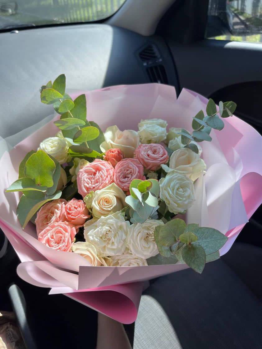Склад : 3 білі кущові троянди , 3 рожеві кущові троянди , 5 кремових троянд ,4 гілок евкаліпту , пакування.