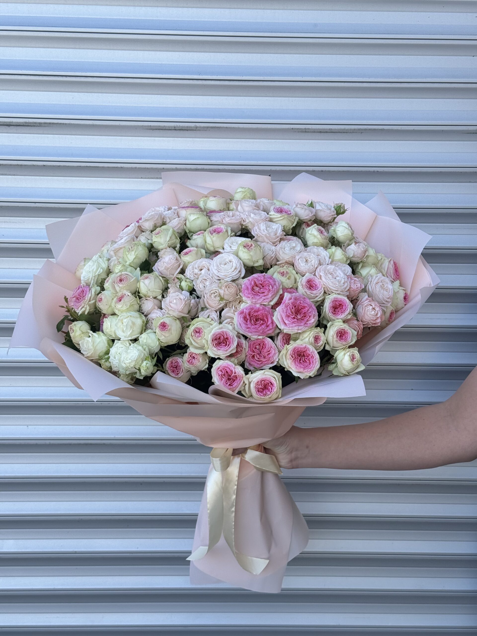 Склад : 45 кущових піоноподібних троянд , пакування.
