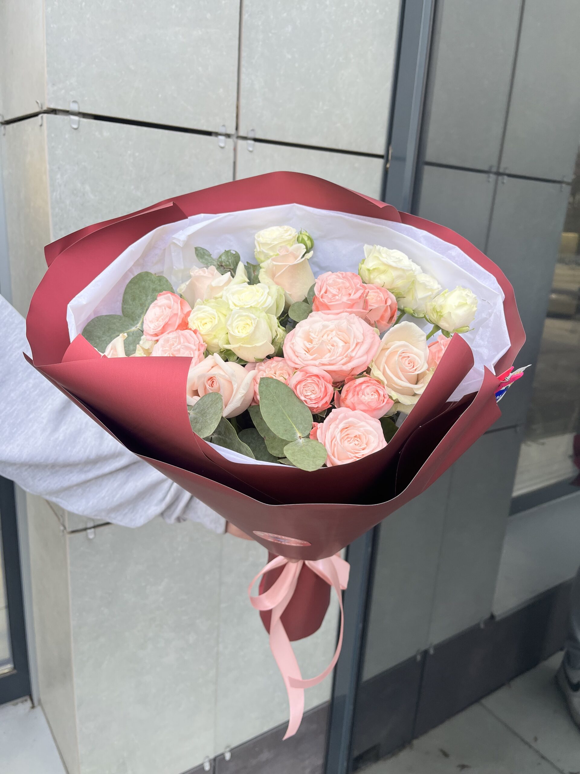 Склад : 3 рожеві кущові троянди , 2 білі кущові троянди , 5 троянд , 3 гілочки евкаліпту , пакування.
