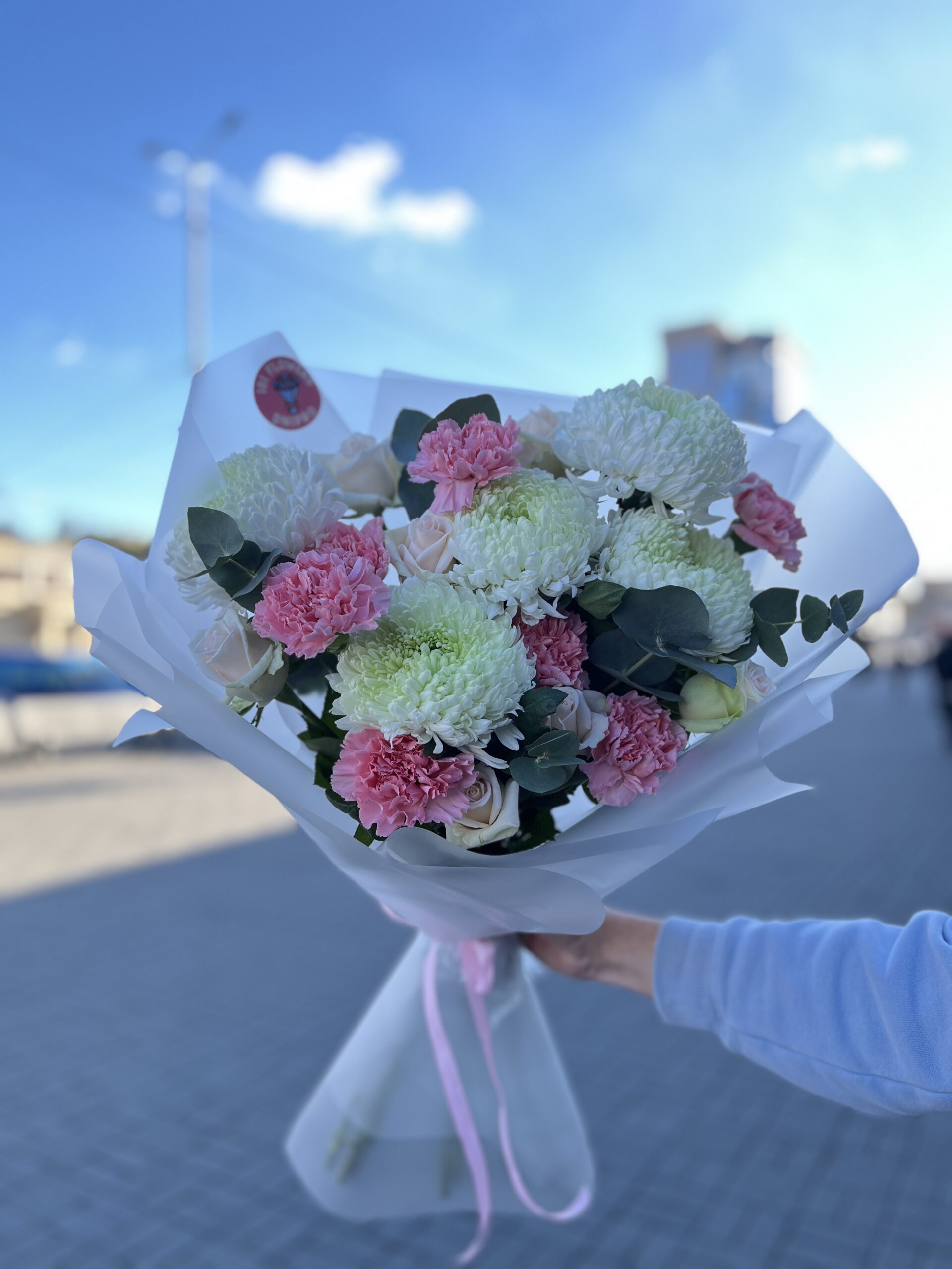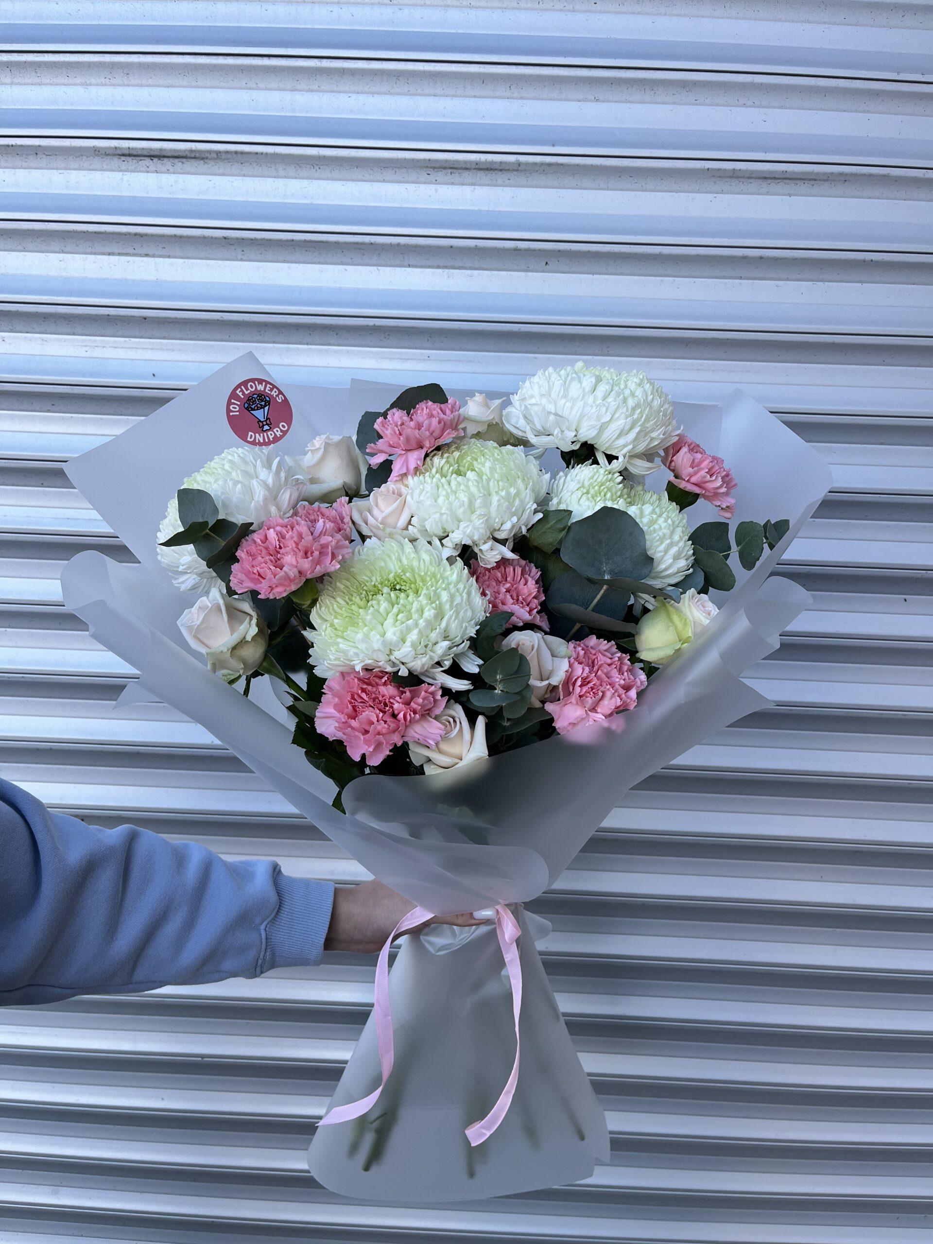 Склад : 5 великих хризантем , 7 троянд , 4 гілочки евкаліпту , 7 гвоздик , пакування.